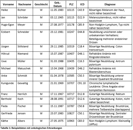 Im Rahmen der folgenden Darstellung werden des Öfteren Beispiele zur Veranschaulichung genutzt. Alle Beispiele basieren auf dem folgenden onkologischen Beispieldatensatz: