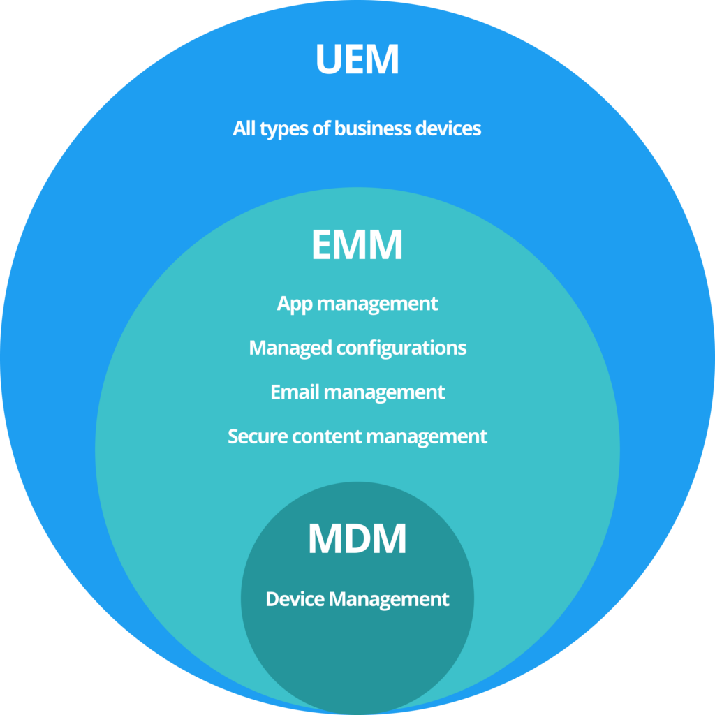 Unter Endpoint Management wird die zentrale Verwaltung von Endpunkten verstanden. Die Verwaltung umfasst einerseits generelle IT-Aktivitäten wie die Inventarisierung oder das Patching von Geräten und andererseits sicherheitstechnische Aktivitäten wie die Anwendung und Steuerung von Sicherheitsrichtlinien eines Gerätes. Im Zusammenhang mit Endpoint Management wird häufig auch von Mobile Device Management (MDM) gesprochen und gemeint. Genaugenommen ist MDM jedoch nur ein Teil des Endpoint Managements. Das Mobile Device Management beschränkt sich auf mobile Geräte, z.B. Smartphones und derer Verwaltung. Mit dem zunehmenden Gebrauch von Smartphones wurde ersichtlich, dass das Mobile Device Management nicht mehr Anforderungen wie Bring-Your-Own-Device (BYOD) und Datensicherheit vollumfänglich gerecht werden konnte. Dies läutete die Geburtsstunde des Enterprise Mobility Managements ein. EMM kombiniert MDM mit mobile Application Management (MAM). Das MAM setzt auf Container, die Apps und Daten sicher isolieren.