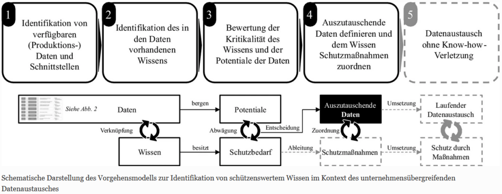 Der vorliegende Beitrag präsentiert ein auf wissenschaftlichen Grundlagen beruhendes Vorgehensmodell mit direktem Praxisbezug zur Identifikation von schützenswertem Wissen und Potenzialen im Kontext unternehmensübergreifenden Datenaustauschs. So sollen die Potenziale des Datenaustauschs gehoben werden, ohne dass es dabei zu Know-how-Verletzungen kommt. In der Literatur findet sich bisher kein Vorgehensmodell, welches in diesem Kontext ohne Anpassung anwendbar wäre. Ein guter Ansatzpunkt für die Entwicklung eines passenden Vorgehensmodells findet sich aber in der Domäne des Wissensschutzes im Kontext von Produktpiraterie: Das von Bahrs et al. und Vladova et al. vorgeschlagene Vorgehen zum Wissensflussmanagement stellt deshalb die Grundlage für die Ableitung eines für den vorliegenden Kontext angepassten Vorgehensmodells dar. Dieses wurde in enger Zusammenarbeit von Wissenschaft und Praxis weiterentwickelt und validiert. Es ist das Ergebnis einer Reihe von Interviews und Workshops mit Wissenschaftlern und Vertretern zweier Industrieunternehmen – einem Fräswerkzeughersteller und einem Fräswerkzeugnutzer –, die in einer Kunden-Lieferanten-Beziehung stehen und partnerschaftlich den vertrauensvollen Austausch ausgewählter Daten entwickeln. Das Vorgehensmodell wird in der Kooperation der beiden Unternehmen angewendet.