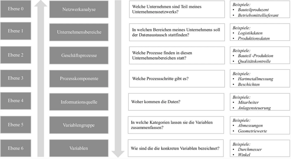 Zur Identifikation und Erhebung von relevanten Daten werden in Schritt 1 die beteiligten Unternehmen in dem für den Austausch relevanten Teil des Wertschöpfungsnetzwerks systematisch betrachtet. Dazu erfolgt eine Analyse der beteiligten Unternehmen auf unterschiedlichen Ebenen in Anlehnung an Gimpel und Röglinger, indem in den einzelnen Unternehmen die vorhandenen Daten identifiziert und erhoben werden. Dies geschieht in den beteiligten Unternehmen unabhängig voneinander und bedingt je nach Unternehmen unterschiedlich viel Aufwand aufgrund der individuellen Gegebenheiten. Dabei werden von jedem Unternehmen die für den jeweiligen Anwendungsfall sinnvollen Unternehmensdaten identifiziert (Ebene 1). Anschließend können in jedem Unternehmensbereich die relevanten Geschäftsprozesse (Ebene 2) und Prozesskomponenten (Ebene 3) erhoben werden. Jede Prozesskomponente kann nun auf die enthaltenen Informationsquellen (Ebene 4) analysiert werden und die verfügbaren Variablengruppen (Ebene 5) und einzelne Variablen (Ebene 6) erhoben werden. Abb. 2 fasst das Ebenen-Modell zusammen und gibt Beispiele je Ebene an. Die Pfeile in der Abbildung verdeutlichen, dass die Analyse nicht Top-Down erfolgen muss. Auch eine Bottom-Up-Analyse, beginnend mit der Identifikation der einzelnen Variablen oder ein Einstieg beispielsweise von einem konkreten Geschäftsprozess ausgehend, kann durchaus sinnvoll sein.
