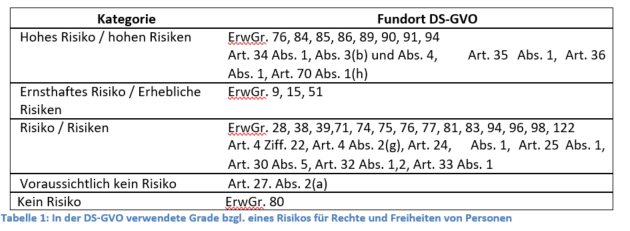 Nach ErwGr. 76 sollen die Eintrittswahrscheinlichkeit und die Schwere des Risikos für die Rechte und Freiheiten der betroffenen Person „in Bezug auf die Art, den Umfang, die Umstände und die Zwecke der Verarbeitung“ bestimmt werden. Dabei kennt die DS-GVO verschiedene Grade bzgl. eines Risikos: