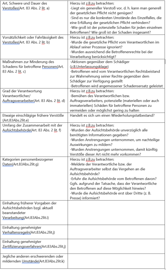 Bei der Verhängung des Bußgeldes sind auch die Vorgaben von Art. 83 Abs. 2 zu berücksichtigen, insbesondere sind zu beachten: