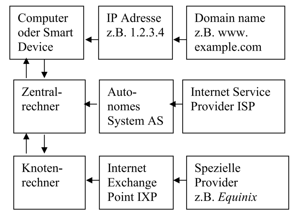 Jeder Computer, der mit dem Internet verbunden ist, hat eine IP-Adresse (IP = Internetprotokoll), eine nach bestimmten Regeln strukturierte Zahl. Das alte 4-stellige System der IP-Version 4 wird nun durch größere Bausteine der IP-Version 6 ersetzt, aber das Prinzip, dass eine Domain mit einer IP-Adressnummer zu einem bestimmten Zeitpunkt verknüpft ist, bleibt gleich. Dies hat die gleiche Funktion wie Telefonnummern für Telefone, d.h. die technische Möglichkeit, Sender und Ziel richtig zu verbinden.Typischerweise startet eine Internetkommunikation bei einem bestimmten Computer und die Daten werden dann an den zentralen Rechner eines Internet Service Providers (ISP) übertragen. Dieser zentrale Computer wird offiziell als Autonomes System (AS) bezeichnet und große Anbieter können viele davon haben. Allerdings müssen die Internet Service Provider miteinander verbunden sein, dies geschieht über Knotencomputer, die offiziell als Internet Exchange Point (IXP) bezeichnet werden. In Wirklichkeit sind dies große Rechenzentren und nicht nur einzelne Computer.