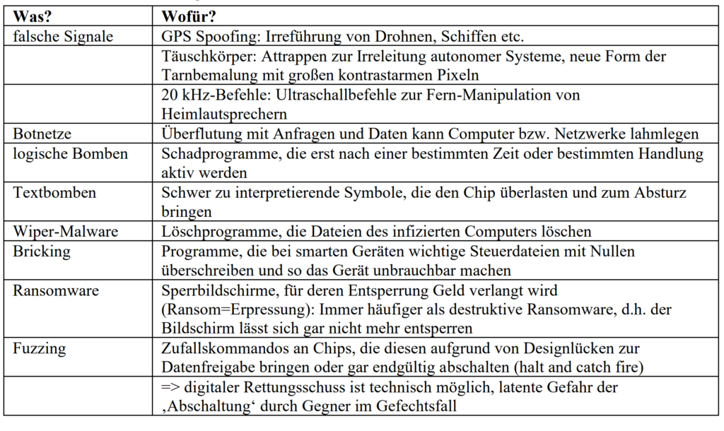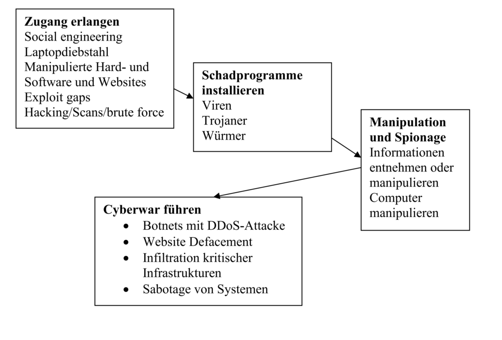 Im Grundsatz werden vor allem drei Angriffsarten erörtert, nämlich die physische Zerstörung von Computern und ihren Verbindungen, die Zerstörung der Elektronik mit Hilfe eines elektromagnetischen Pulses und der Angriff auf und die Manipulation von Computern und Netzwerken mit Hilfe von Schadprogrammen (Malware).