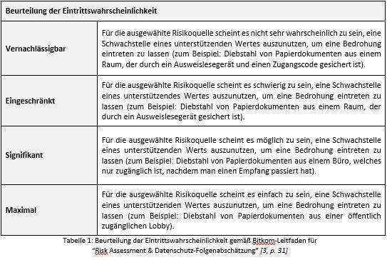 Im Zuge der Risikoanalyse wird der Risikowert ermittelt (= Höhe des identifizierten Risikos). In einem ersten Schritt werden die Eintrittswahrscheinlichkeit einer Bedrohung sowie die zu erwartenden Auswirkungen bewertet. Für die Bewertung der Eintrittswahrscheinlichkeiten und Auswirkungen werden seitens DSGVO keine Kategorien vorgegeben. Mögliche Einstufungs-Kategorien können beispielsweise wie folgt vorgegeben werden: