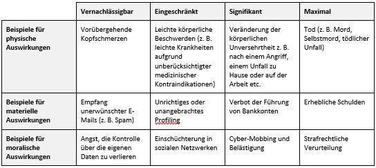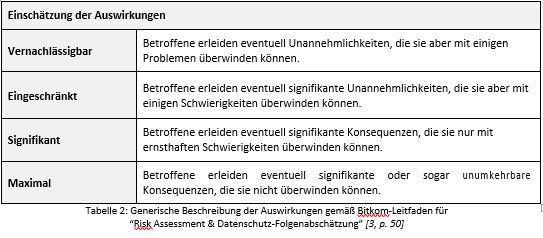 Untenstehend sind Beispiele für die Einschätzung der Auswirkungen aus Sicht der Betroffenen angeführt. Die vollständige Auflistung aller Beispiele ist im Bitkom-Leitfaden für “Risk Assessment & Datenschutz- Folgenabschätzung” ersichtlich.