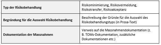 - Risikoakzeptanz (bewusste Entscheidung, keine weiteren Massnahmen zu treffen) Um dem laut Artikel 5 Absatz 2 DSGVO geforderten Datenschutz-Grundsatz der „Rechenschaftspflicht“ nachzukommen, wird empfohlen, im Zuge der Risikobehandlung folgende Informationen zu dokumentieren: