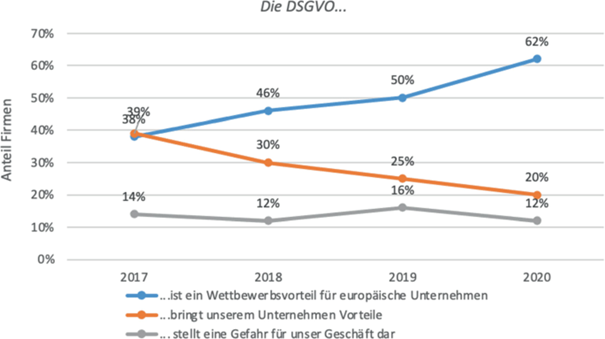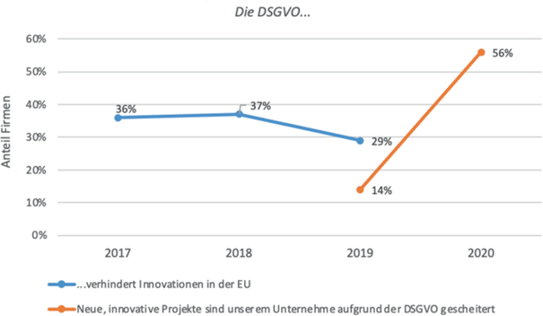 Dass jedoch unter den befragten Firmen der Anteil jener, der angibt, Innovationsprojekte seien wegen der DSGVO gescheitert, massiv steigt (von 14 % auf 56 % zwischen 2019 und 2020), gleichzeitig aber der Anteil derjenigen, der angibt, sie seien durch die DSGVO bedroht, zurückgeht und auf niedrigem Niveau verharrt (12 %) und der Anteil, der in der DSGVO einen allgemeinen Wettbewerbsvorteil für europäische Firmen erblickt, ebenfalls weiterhin stark wächst (von 50 % auf 62 %) legt nahe, dass die DSGVO Innovationsaktivitäten allgemein nicht in einem kritischen Ausmaß behindert.
