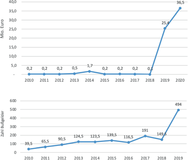 Wie Abb. 4 zeigt, ist die Höhe sowie die Zahl der verhängten Bußgelder dennoch erheblich angestiegen. Bewegte sich der durchschnittliche Gesamtwert der jährlich von allen deutschen Datenschutz-Aufsichtsbehörden verhängten Bußgelder in den Jahren 2010 bis 2018 noch im unteren sechsstelligen Bereich, wurden 2019 bereits Bußgelder von insgesamt mehr als 25 Mio. EUR verhängt, und im Jahr 2020 waren es bis Herbst bereits mindestens 36,5 Mio. EUR. Gleiches gilt für die Anzahl der Bußgelder. Es scheint, dass in keinem Jahr zwischen 2010 und 2018 mehr als 191 Bußgelder verhängt wurden, meist erheblich weniger als 150. Dagegen waren es 2019 bereits 494.