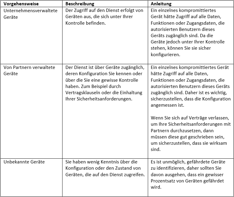 Für einige Ihrer Daten und Workloads kann es sinnvoll sein, die Verwendung von Geräten, die von Unternehmen ausgegeben und verwaltet werden, mit einer geeigneten Konfiguration zu verlangen, um eine ausreichende Sicherheit zu gewährleisten. Die mit den verschiedenen Optionen verbundenen Risiken sind in der obigen Tabelle beschrieben.