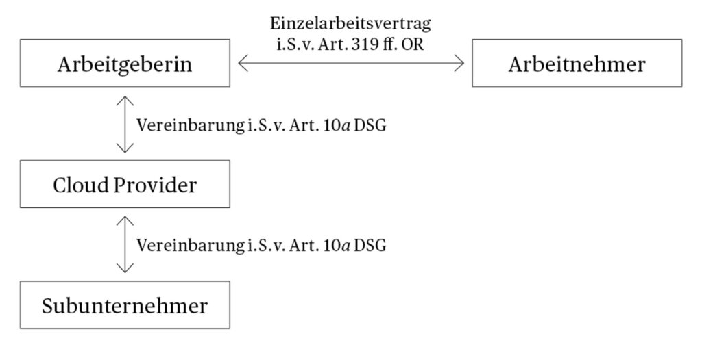 Je nach Ausgestaltung der IT-Infrastruktur eines Voice Recognition Systems liegen verschiedene Rechtsbeziehungen vor. Bei Cloud-Lösungen wird die vertraglich vereinbarte Software über eine Applikation oder einen Browser unmittelbar in der Datenwolke ausgeführt (Software as a Service). Die Spracheingaben werden an einen Server übermittelt und analysiert, worauf die entsprechenden Befehle an das System retourniert werden. Zwischen der Arbeitgeberin und dem Cloud-Provider muss eine Vereinbarung nach den Bestimmungen der Datenbearbeitung durch Dritte (Art. 10a DSG) bestehen. Der Cloud-Provider kann zur Erbringung seiner Leistung auf die Infrastruktur, wie Netzwerk, Server oder Speicher, von Subunternehmern zurückgreifen.